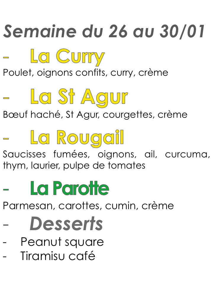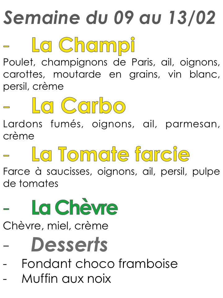 Menu de la semaine Venez découvrir les sauces de la semaine ! Et bien sûr, toute la semaine, la sauce Basic : Dés de jambon, crème, emmental ! 15 avril 2016 etpateseer1